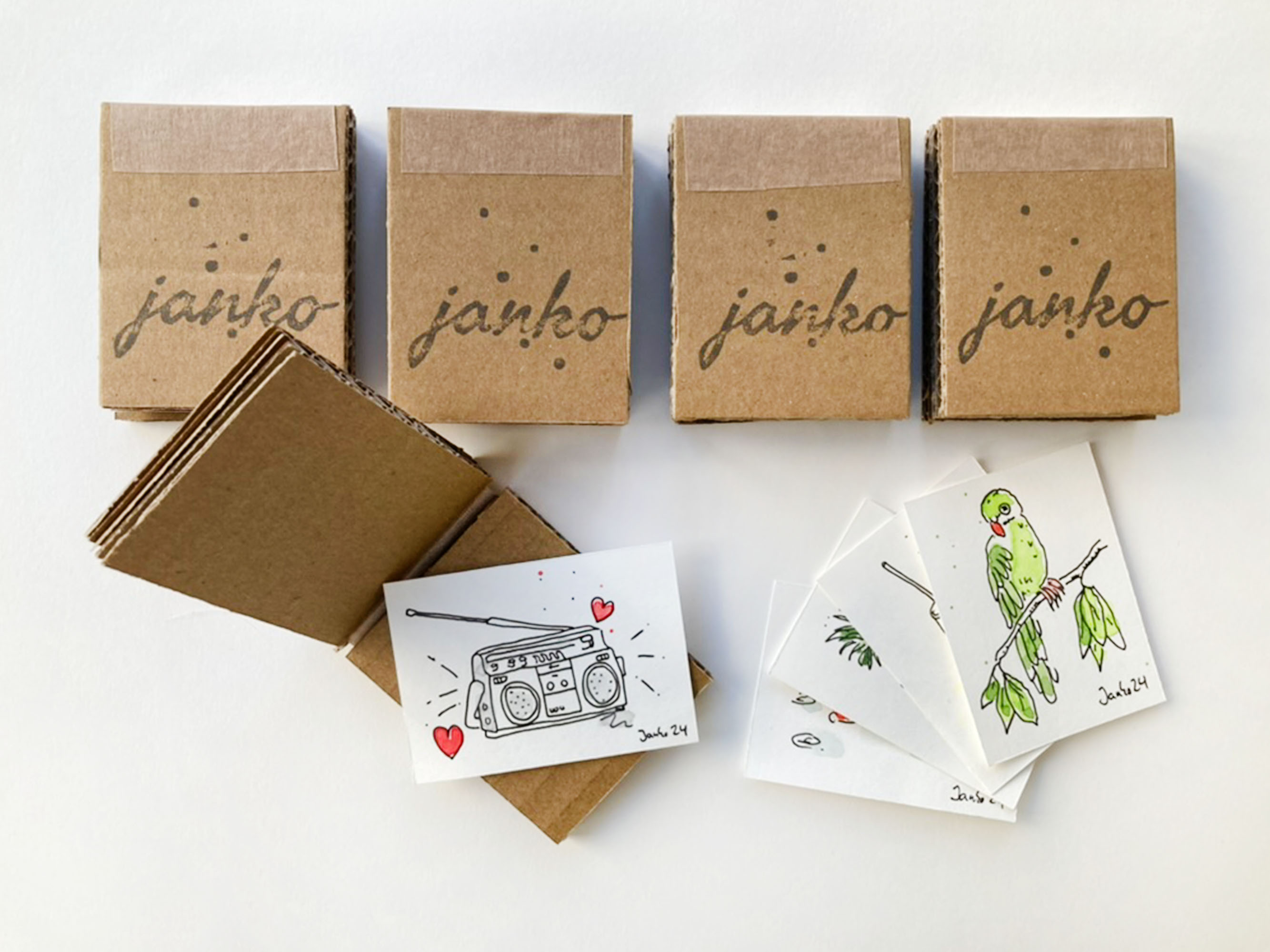 Du bekommst 5 Original-Zeichnungen aus dem Jankomat. Größe: 5×7 cm. Welche Zeichnungen genau, ist natürlich eine Überraschung. 🙂